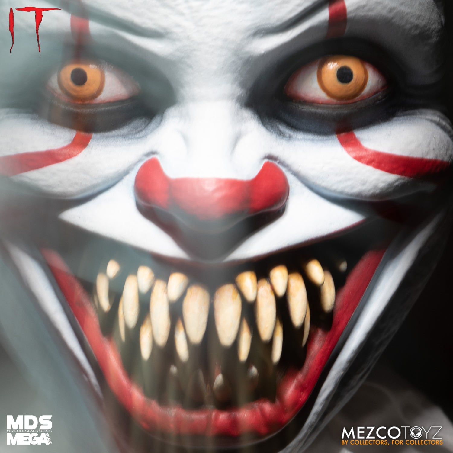 The MDS Mega Scale IT: Talking Sinister Pennywise features an all-new head sculpt of the shape-shifting clown sporting a grimacing smile from ear-to-ear. If that’s not enough to fuel your nightmares, he also says 6 of his most famous phrases from the film including “tasty, tasty, beautiful fear!""