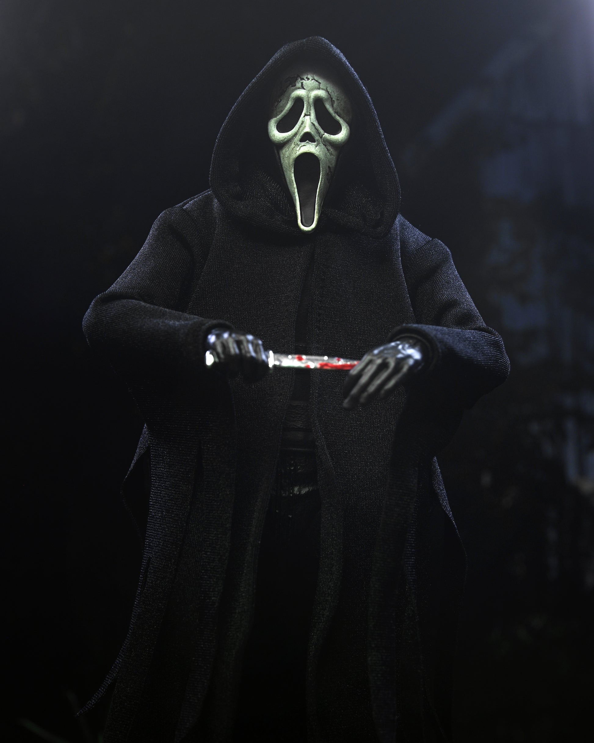Ghost Face is back and coming in hot! This all-new Ultimate 7-inch scale action figure features updated sculpt and articulation beneath a new, opening soft-goods cloak with three interchangeable hood options. In addition to NECA's updated faceplate technology, Ghost Face comes with four interchangeable masks: chrome, white, devil, and aged. Other accessories include chrome knife, bloodied chrome knife, pitchfork, flamethrower with flame attachment, two machetes, and interchangeable hands—including the iconic “knife wipe” hand for the first time at retail. Presented in collector-friendly box with window flap, making this devilish slasher the hottest Ghost Face figure yet!