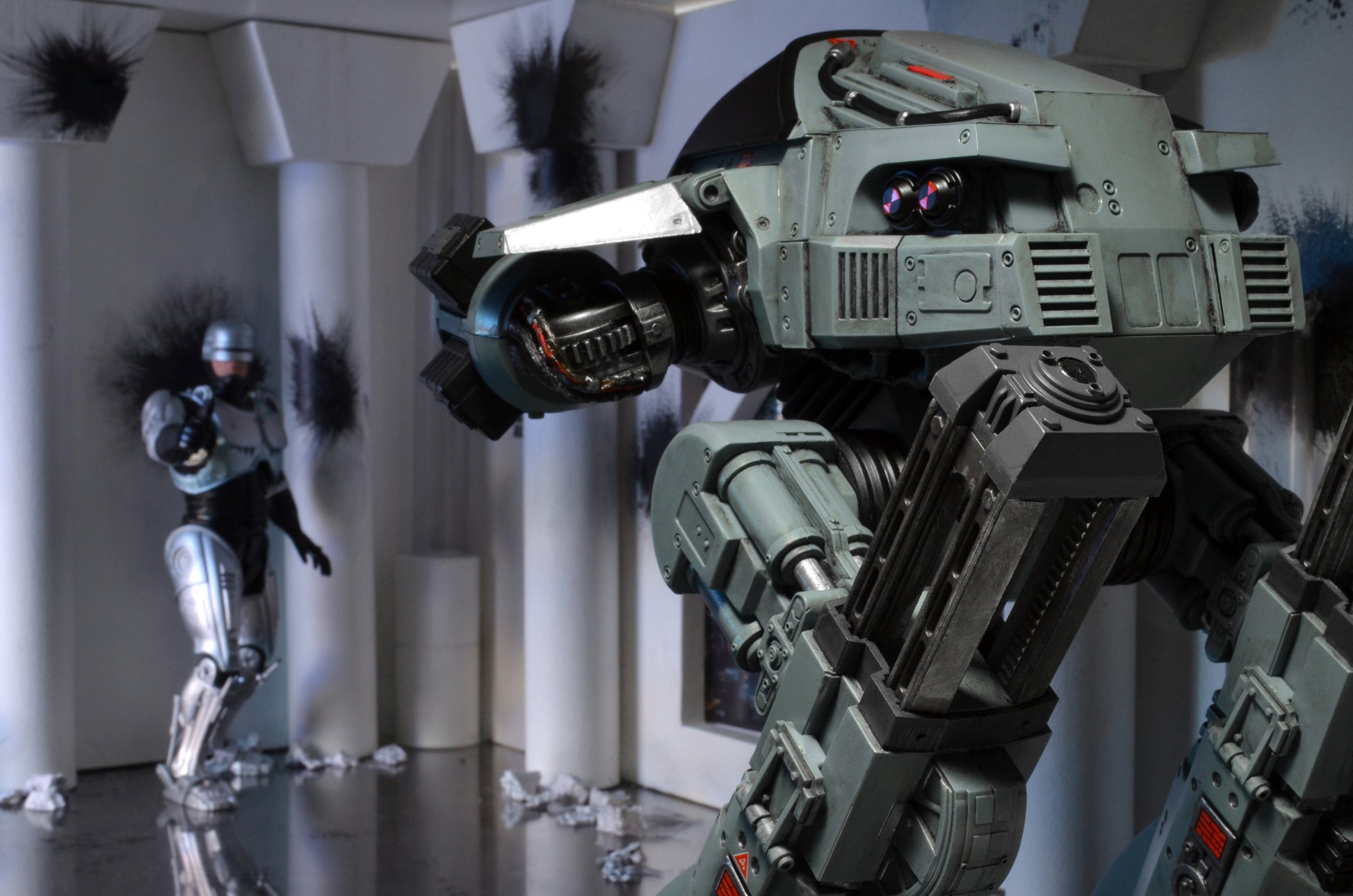 ED-209 is fully poseable and features incredible detail. Features include, articulated head, legs that slide up and down, hinged arm wing panels, poseable cannon arms, and pop-out rocket launcher on the right arm. Also features movie accurate sound effects and dialogue – press a button and hear the hydraulic machinery sounds, the guttural metal growls, “Warning, Throw Down Your Weapon, You Have 15 seconds to comply” and more! This is a massive figure and finally provides a worthy opponent for Robocop. Comes in deluxe closed box packaging featuring original illustrations and product photography highlighting key action features.